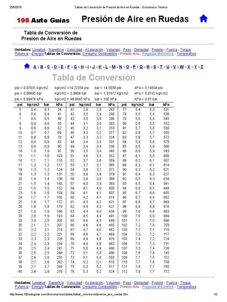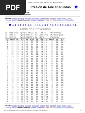 Tablas De Conversion De Presion De Aire En Ruedas Diccionario Tecnico Pdf